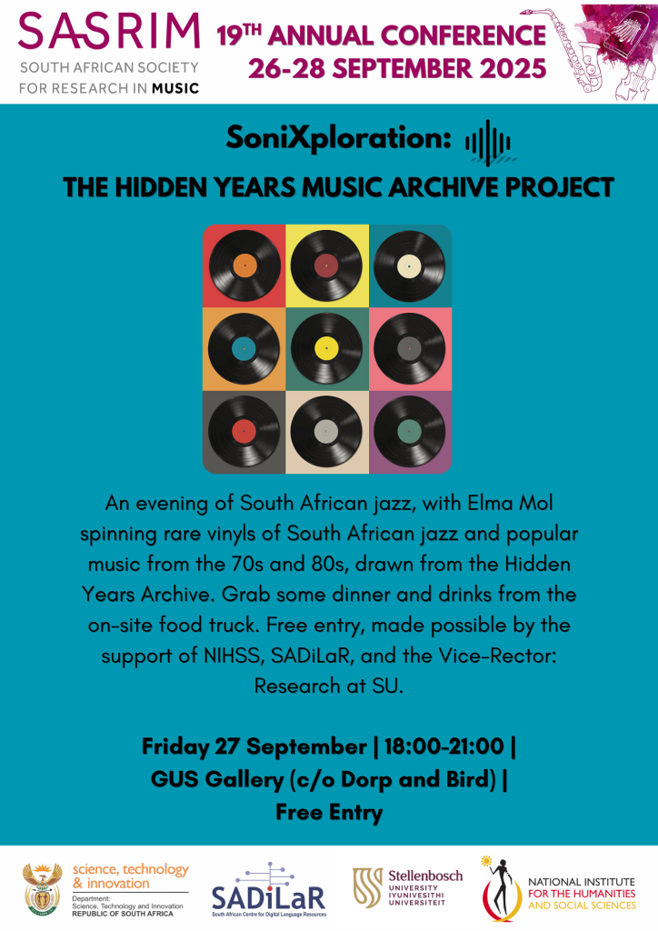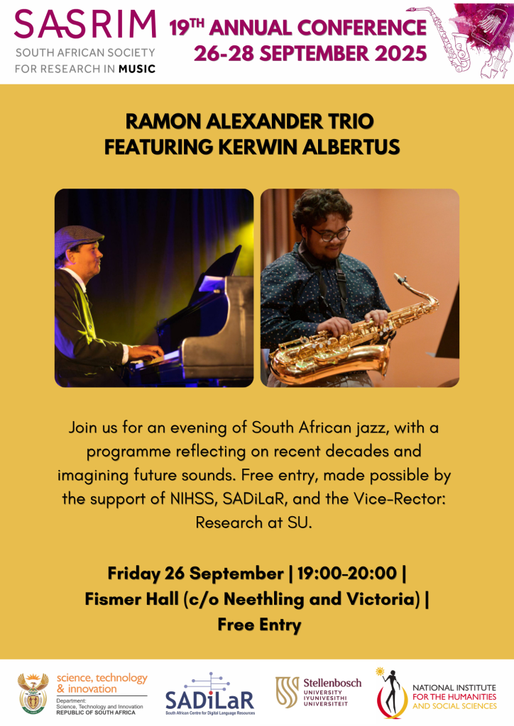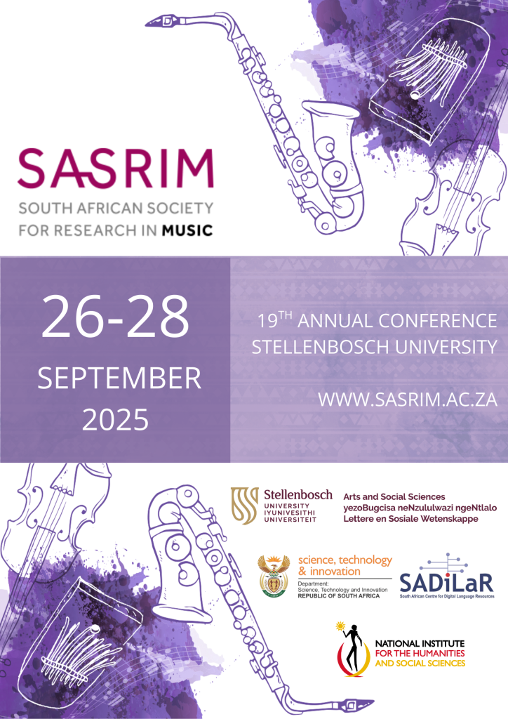 Registration Platform SASRIM 19TH ANNUAL CONFERENCE 2025 Department of Music, Stellenbosch University | 26-28 September 2025 CONFERENCE PROGRAMME ABSTRACTS BOOKLET INFORMATION FOR DELEGATES Stellenbosch University Map Registration for in-person attendance has closed. You can still register for online attendance: Online Delegate – 2025 R400.00 Ticket Detail